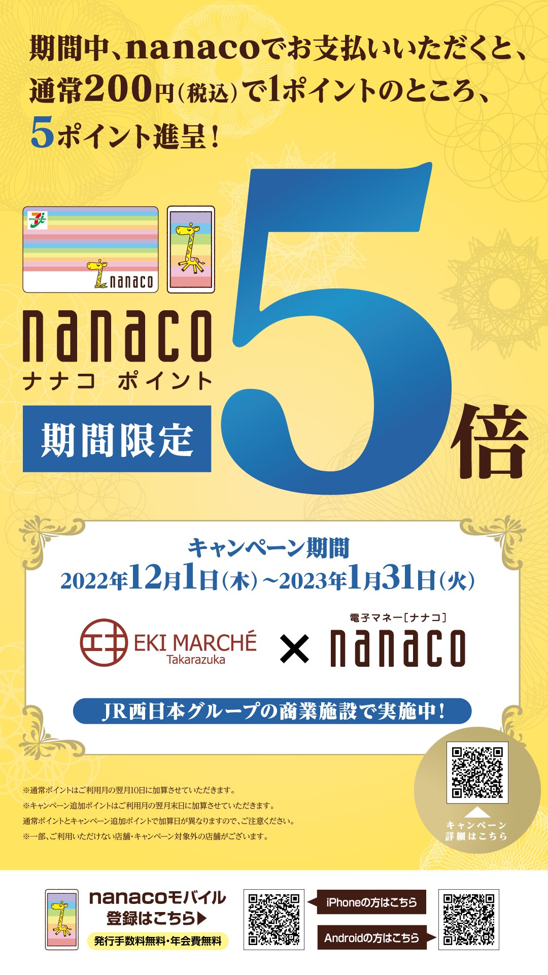 Realizaré una campaña para presentar el punto nanaco de 5 veces normales cuando le haga colocar una cuenta en el dinero electrónico «nanaco» en aproximadamente 3,000 tiendas (excepto algunas tiendas) de las instalaciones comerciales que el grupo de OESTE hijo dirige a partir del 1 de diciembre de 2022.